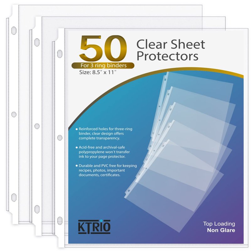 Ktrio Non-Glare Sheet Protector 8.5 x 11 Inches Clear Page Protectors, Plastic Sleeves for Binders, Paper Protector for 3 Ring Binder Letter Size Top Loading. Specification: Measure&Content: Each sheet protector can hold 8.5 x 11 inch letter size sheet paper, 0.058mm/2.28mil thickness paper protectors; 50 pack page protectors. Non-glare Surface: Non glare paper protector provides a clear view of pages and reduces glare. Transparent and Durable: Reinforced holes on the plastic sheets for three-ring binder, clear design offers complete transparency for easy viewing. Top Loading: Easy top loading feature on clear sheet protectors provides a wider top opening, so paper is easy to slide in and take out. High Quality: High quality polypropylene material is ideal for keeping recipes, photos, important documents, certificates. Page protector keeps them from the wear and tear.