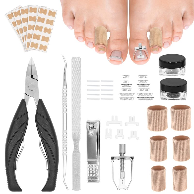 Professional pedicure tools include 1 large heavy-duty toenail clipper,1 Corrector, 5 Nail Pressurizers, 5 Correction Patch(10PCS/Patch),6 Gel Toe Protectors (S*2/M*2/L*2); 12 Toe Wire Fixer,10 Corrector Strips, 1 Glass Nail File, 1 nail clipper, 1 Double-ended nail picker, Multi-combination kits are available for all your toenail correction needs.