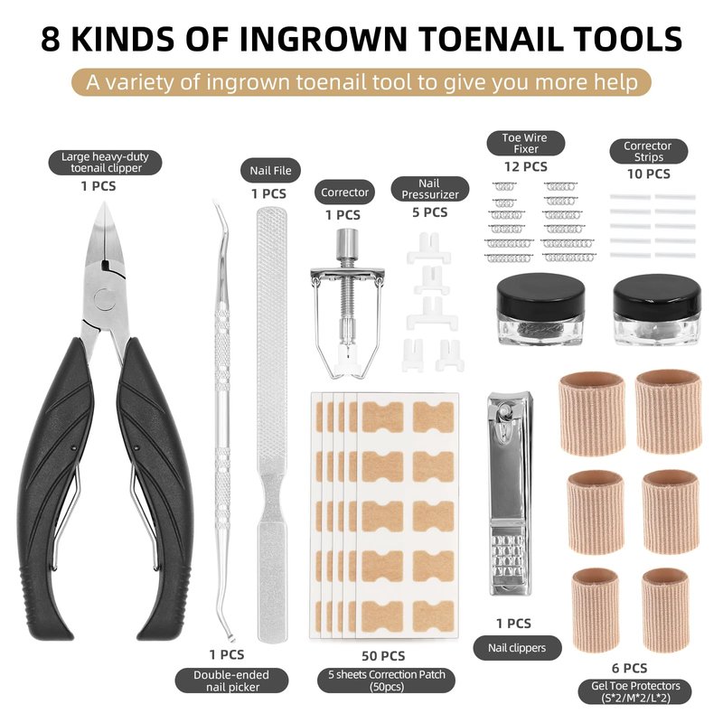 - 【Ingrown Toenail Removal Kit】Professional pedicure tool includes 1Large heavy duty toenail clipper; 1 Corrector, 5 Nail Pressurizer; 5 large sheets of Correction Patch(50pcs); 6 Gel Toe Protectors(S*2/M*2/L*2);12 Toe Wire Fixer;10 Corrector Strips;1 Nail File;1 nail clipper;1 Double-ended nail picker; Multi-combination kits are available for all your toenail correction needs.