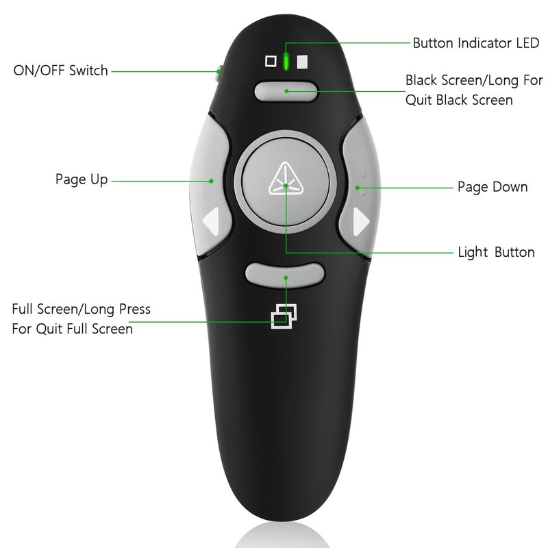 - 【Upgraded Version Of Presentations Remote】:the Mouse Clicker Featuring 2.4 GHz RF( Class I, Output Power<1mW)Wireless Technology, Upgraded Portable Metal Mini Receiver. It's Rugged, Durable and Can More Quickly Identify Computer Systems. Additionally, LED Button Indicators Have been Added to Make the Powerpoint Clicker with Pointer Control Easier.