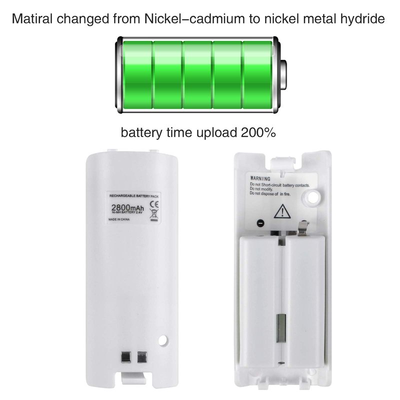 - HIGHER CAPACITY BATTERY - matiral changed from Nickel-cadmium to nickel metal hydride, so improved 200% capacity compare with those normal 2800mAl rechargeable battery, lasts 3~5 times longer than the standard AA batteries. and The rechargeable battery pack fits perfectly on the motion plus controllers,kids so happy playing games without dead power worry.