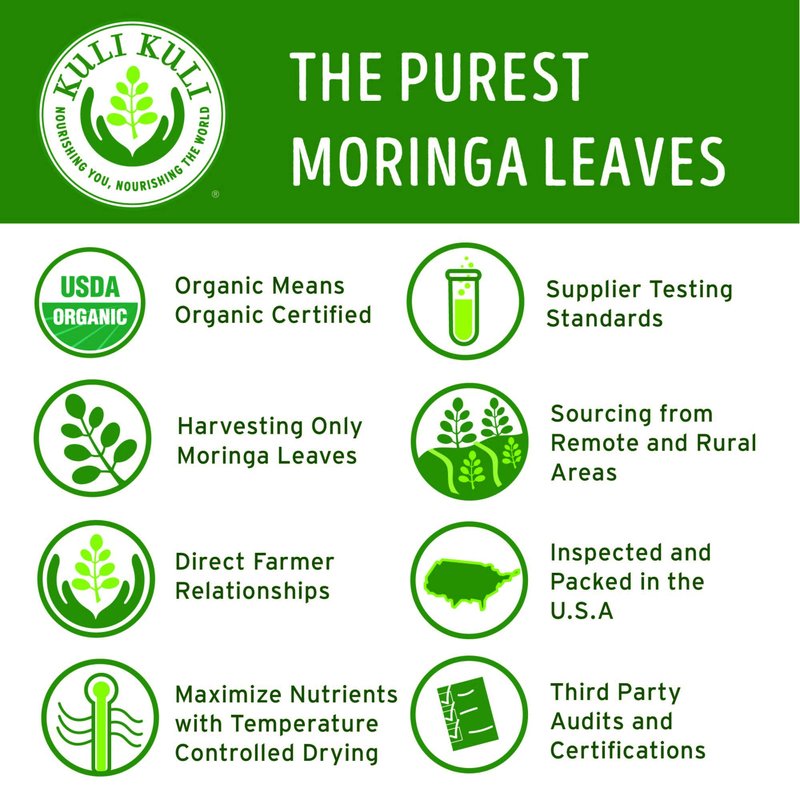 - NON-GMO MORINGA: Kuli Kuli only sources high quality & sustainably grown moringa. The green leaf of the moringa tree is a powerful superfood available as tea, powder, energy shot, smoothie mix & in snack bars.