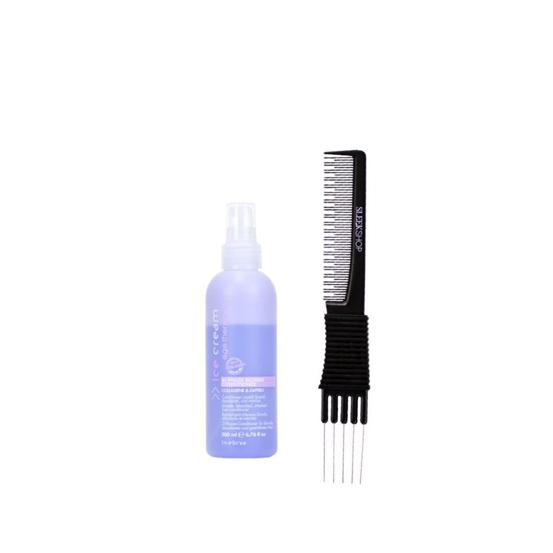 This kit includes a quantity of (1) Premium Carbon Heat-Resistant Multi-Use Teasing Comb which is an anti-static, lightweight, durable comb with specially designed grips for non-slip. This multi-purpose comb can also be used for braiding and teasing hair. 5 metal picns Inebrya Ice Cream Age Therapy Bi-Phase Blonde Conditioner Bi-phase Blonde Conditioner is a leave-in bi-phase conditioner that restores the beauty of your blonde hair, showing off highlights and light shades to their best advantage and reducing warm tones. The hair will be detangled, soft, silky and easy-to-comb. The cosmetic colour will be enhanced and protected, thanks to the formula that can reduce undesired warm tones and illuminate light tones, cooling them. Its formula is enriched with Collagen, Elastin and Sapphire Microcrystals that endow it with a regenerating and revitalising action on the hair, adding elasticity and volume.