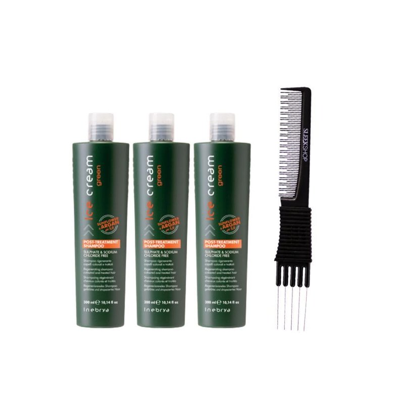 kuss Inebrya Ice Cream Green Post-Treatment Shampoo (10.14 oz) with Teasing Comb Pack of 3