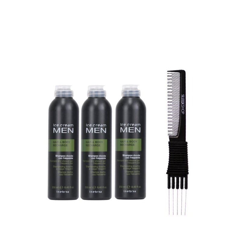 kuss Inebrya Ice Cream Men Hair & Body Recharge (8.45 oz) with Teasing Comb Pack of 3