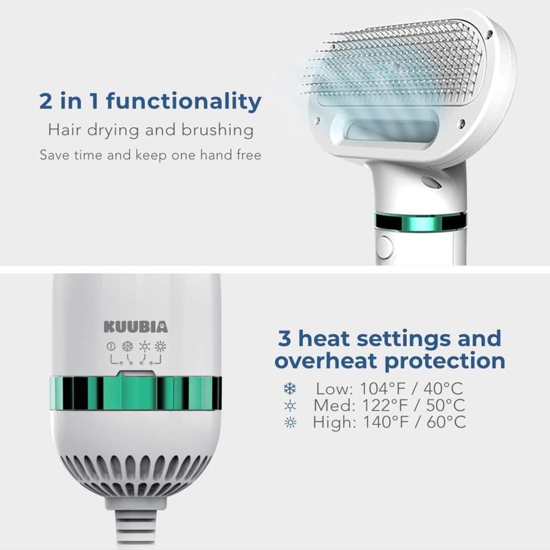 - 【Dryer & Brush in One】This versatile 2-in-1 pet grooming dryer is the perfect solution for drying your pet with gentle care. Ideal after a bath, a walk in the rain, or on chilly winter days, this combined dryer and brush offers warmth and comfort to your dog. With one smooth motion, you can simultaneously brush and dry your pet.