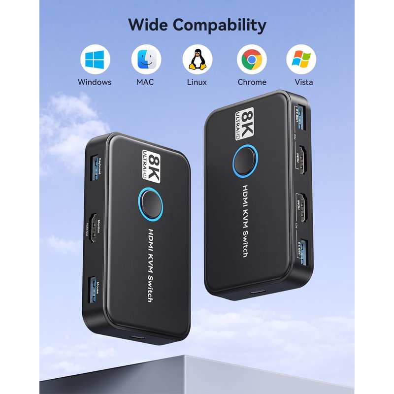 - 【Ultra HD 8K@60Hz Visual Enjoyment】KVM Switch 1 monitors 2 computers supporting resolution 8K@60Hz, make image display 3D and more exquisite and realistic,color is more bright and moving,really give a feast for your eyes. Of course, it also support 4K@30Hz and4K@60Hz or lower resolution