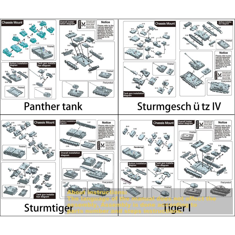 - INCLUDING: Sturmtiger, Tiger I, Sturmgesch¨¹tz IV, Panther tank (Each tank is random color in green and gray). Total in 4 Set. 30 parts for each model tank. They are German-made tanks in the Second World War.