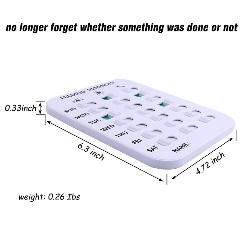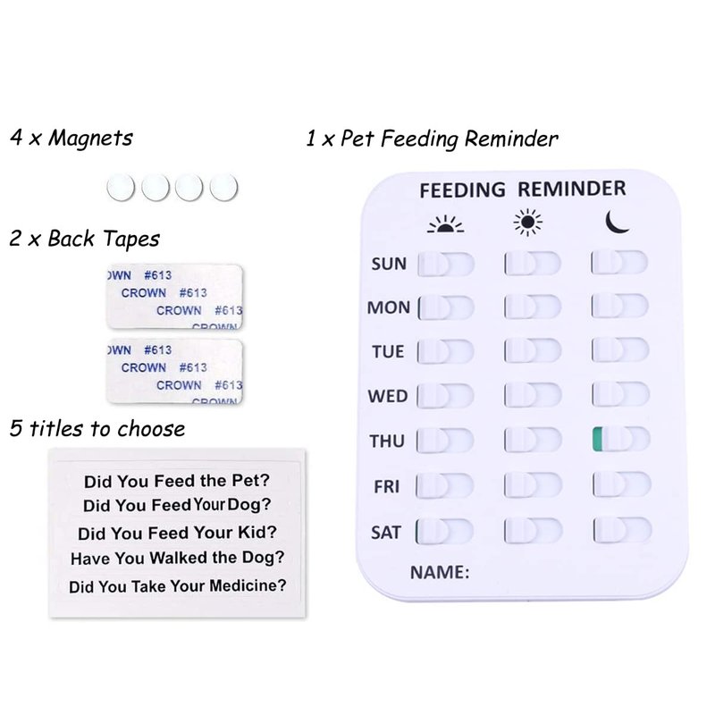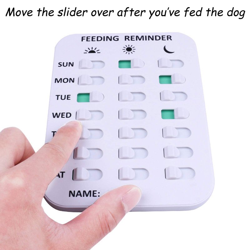 - ✍ Pet feeding reminder helps keep track of when the dog cat was fed with simple color coding. No batteries needed! Move the slider over after you’ve fed the dog, and slide them all back each week. Green means fed!