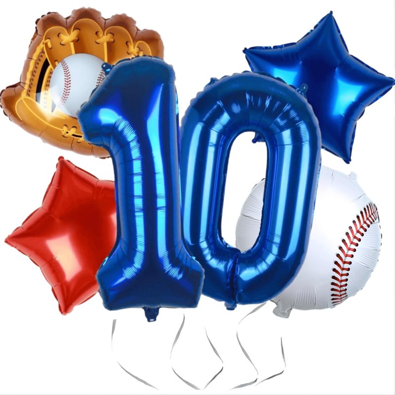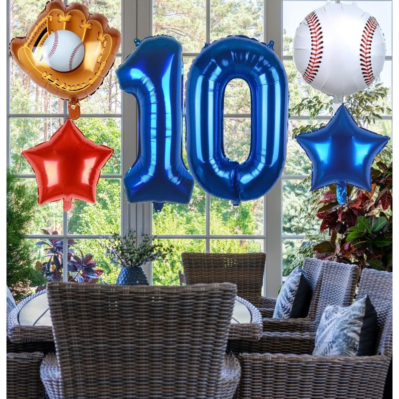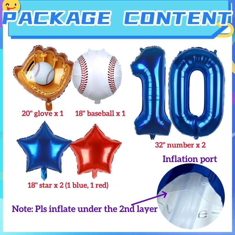 - 6 PCS PACK | BASEBALL PARTY DECORATIONS: 32inch navy blue number 10 balloon x 1, 18inch foil baseball balloons x 1, 20inch baseball glove balloons x 1, 18inch star balloons (1 dark blue, 1 red), straw x 1, 32ft ribbon.