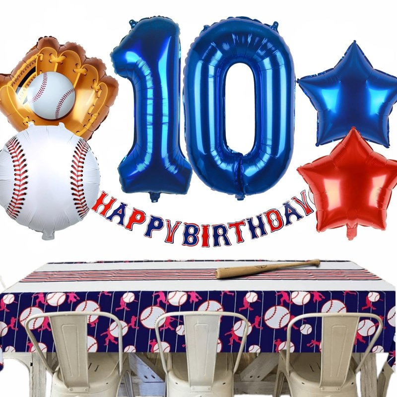 - BASE BALL THEME DESIGN | SPORTS BIRTHDAY DECORATIONS: Featured navy blue red white colors, with the big number 10 balloon, great combination of sports and birthday, fantastic baseball birthday party supplies for 10 years old boys, help children step in a happy, passionate and dynamic sports atmosphere.