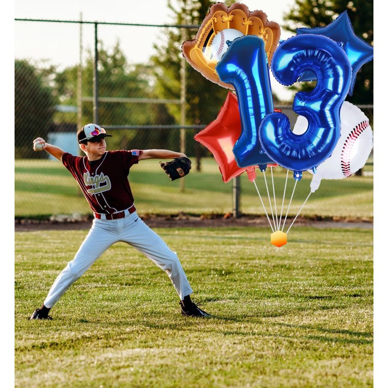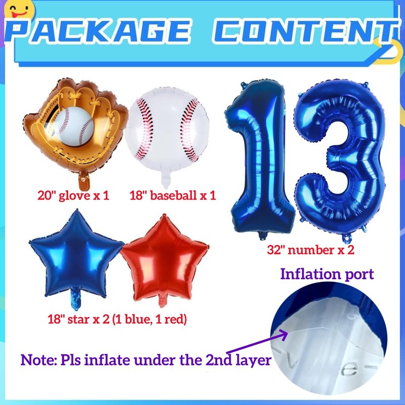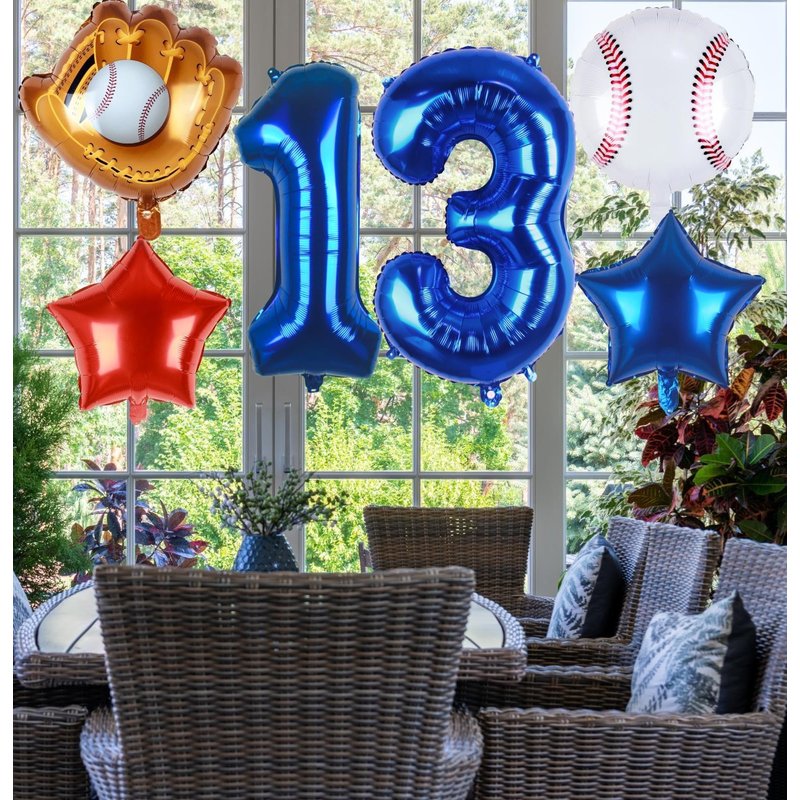- 6 PCS PACK | BASEBALL PARTY DECORATIONS: 32inch navy blue number 13 balloon x 1, 18inch foil baseball balloons x 1, 20inch baseball glove balloons x 1, 18inch star balloons (1 dark blue, 1 red), straw x 1, 32ft ribbon.