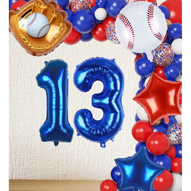 - Are in classic navy blue red white colors, were designed with elements of sports, with its’milestone number 13 balloon, are ideal base ball birthday decoration for 13 years old boys, game theme party decorations, baseball balloon arch kits, Thanks giving party favors, Christams New Year Eve balloon decorations.