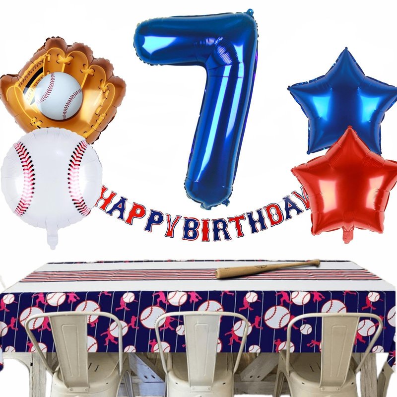 - BASE BALL THEME DESIGN | SPORTS BIRTHDAY DECORATIONS: Featured navy blue red white colors, with the big number 7 balloon, great combination of sports and birthday, fantastic baseball birthday party supplies for 7 years old boys, help children step in a happy, passionate and dynamic sports atmosphere.
