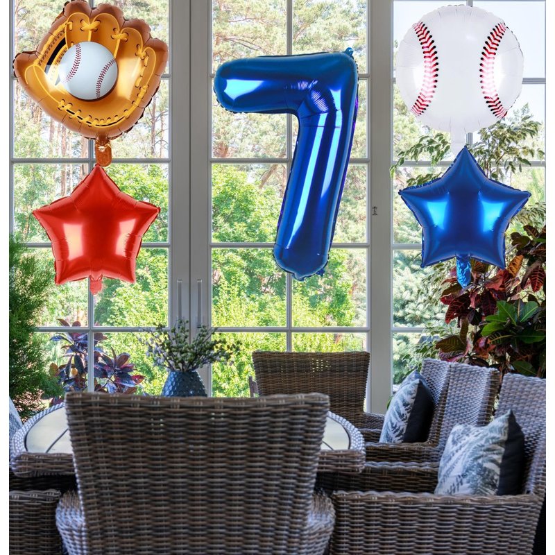 - 5PCS PACK | BASEBALL PARTY DECORATIONS: 32inch navy blue number 7 balloon x 1, 18inch foil baseball balloons x 1, 20inch baseball glove balloons x 1, 18inch star balloons (1 dark blue, 1 red), straw x 1, 32ft ribbon.