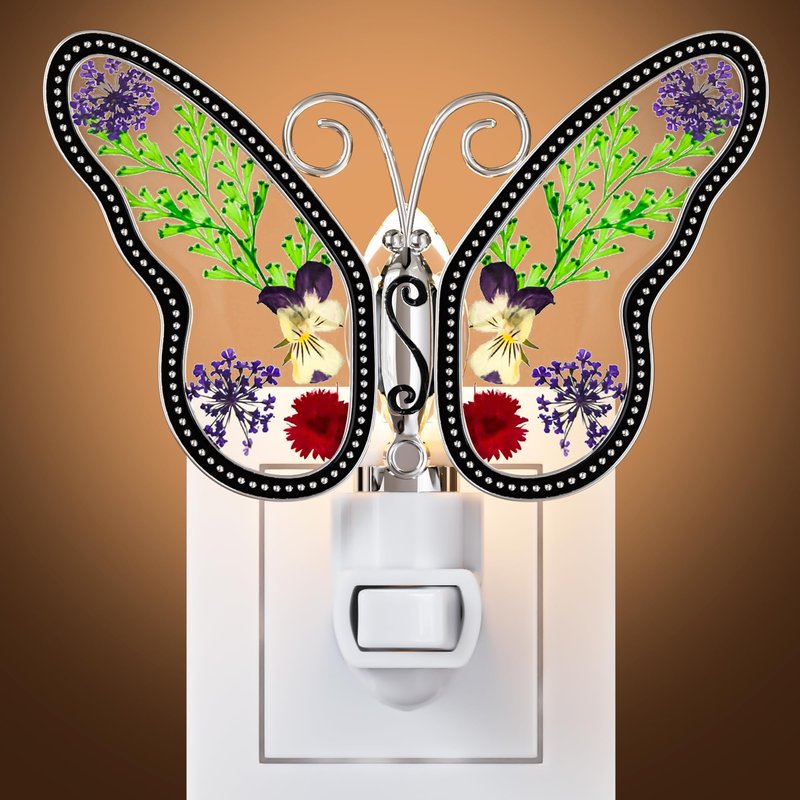 - Fused Stained Glass Night Lighter :The metal solder has been finished with a vintage charcoal patina and waxed to keep the finish beautiful for years to come. If needed you can always buff it with a soft dry cloth. Constructed using the 'Glass & Flower and metal ,Pressed Flower Wings Embedded in Glass with Metal Trim Butterfly ,Lead free solder has been used to protect you and the environment Designed and manufactured by Tiffany Lamp & Gift Factory