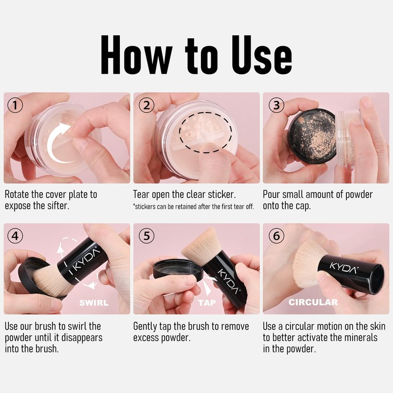 - SUGGESTED USE - SWIRL: pour small amount of powder onto the cap, use our brush to swirl the powder until it disappears into the brush. TAP: gently tap the brush to remove excess powder. CIRCULAR: use a circular motion on the skin to better activate the minerals in the powder. REAPPLY: for a better base makeup and coverage effect, we recommend to reapply.