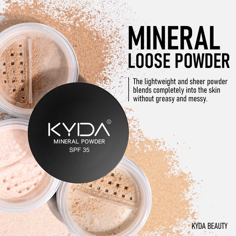 - KYDA MINERAL SETTING POWDER - our mineral loose powder provides a sheer, weightless powder texture with translucent tone with a ultra-fine pearl mica, effectively extend the base makeup and allowing it to be worn longer. Note: This link does not include the brush.
