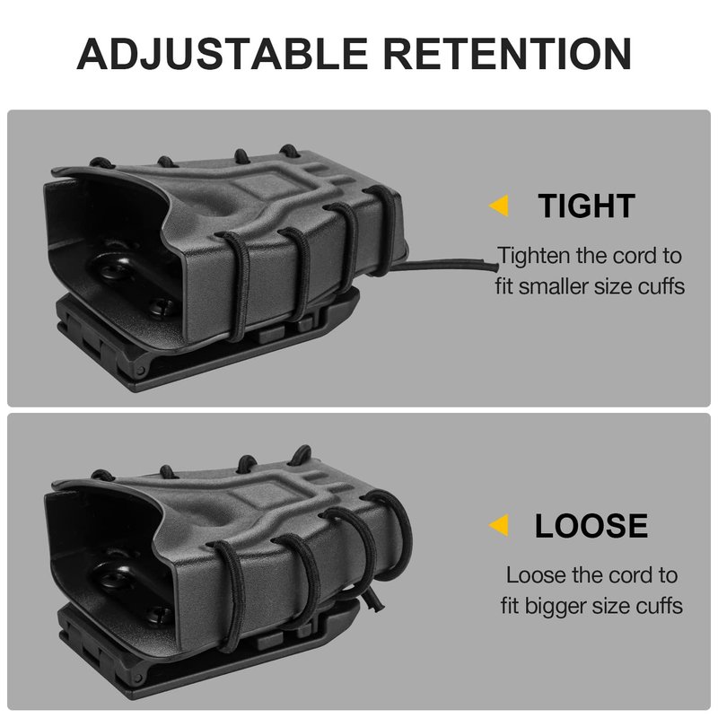 - ADJUSTABLE RETENTION - Retention can be adjusted to fit different size handcuffs.