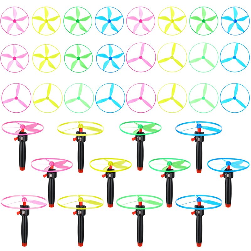 - Package Content: You will get 36 pieces of flying toys, composed of 12 string launchers and 24 flying saucers with 2 sizes (each launcher is equipped with 4 flying saucers colors), simple and interesting to play, enough quantity for you to share with playmates