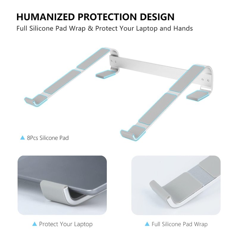 A total of eight soft non-slip silicone pads are used in the laptop stand to ensure that the notebook and the stand will not slide;