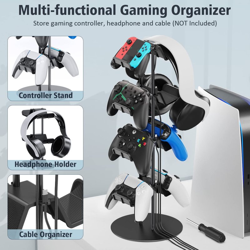 Kytok Controller Stand 4 Tiers with Cable Organizer for Desk, Universal Controller Display Stand Compatible with Xbox PS5 PS4 Nintendo Switch, Headset Holder & Desk Mounts for 8 Packs Controller