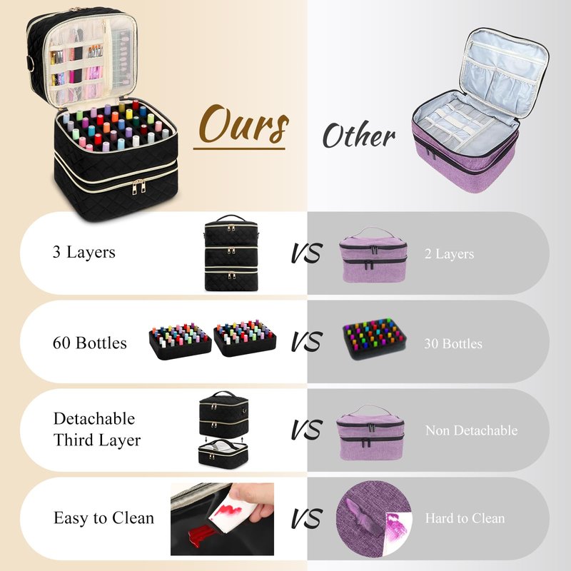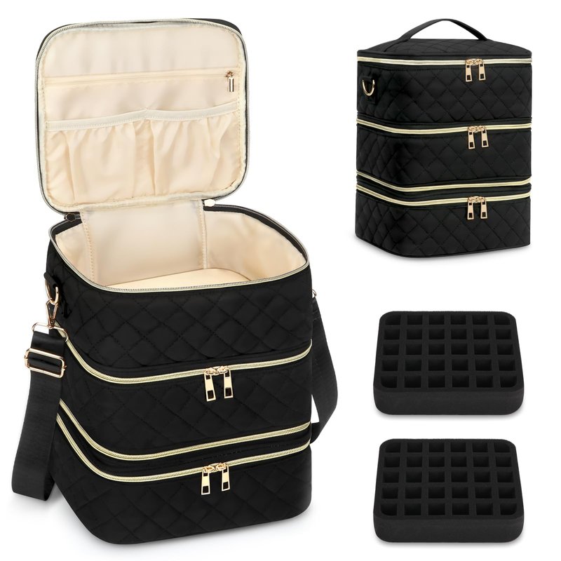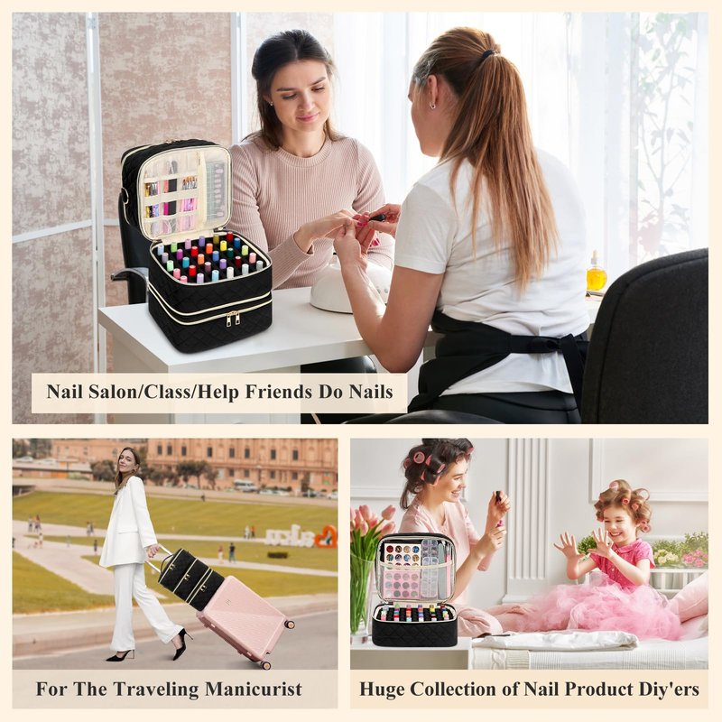 - 【 3 Layers Large Capacity+ Hold 60 Bottles 】Compared to ordinary double layer nail enhancement bags on the market, our nail polish case is 3 layers design. The upper layer has large space to store nail lamp, with some small pockets can store a lot of manicure tools, such as nail bruhses, nail drill machine and etc. The lower two layers both are equipped with a 30 nail polish bottles holes divider which can protect nail polish from being broken and stand upright.