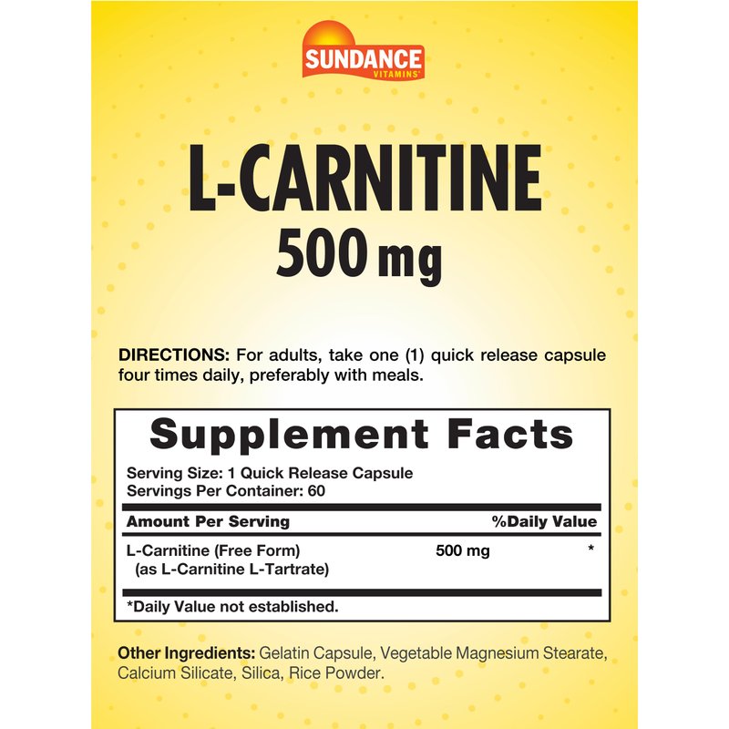L-Carnitine 500mg | 60 Capsules | Free Form Amino Acid | Non-GMO and Gluten Free Supplement | by Sundance