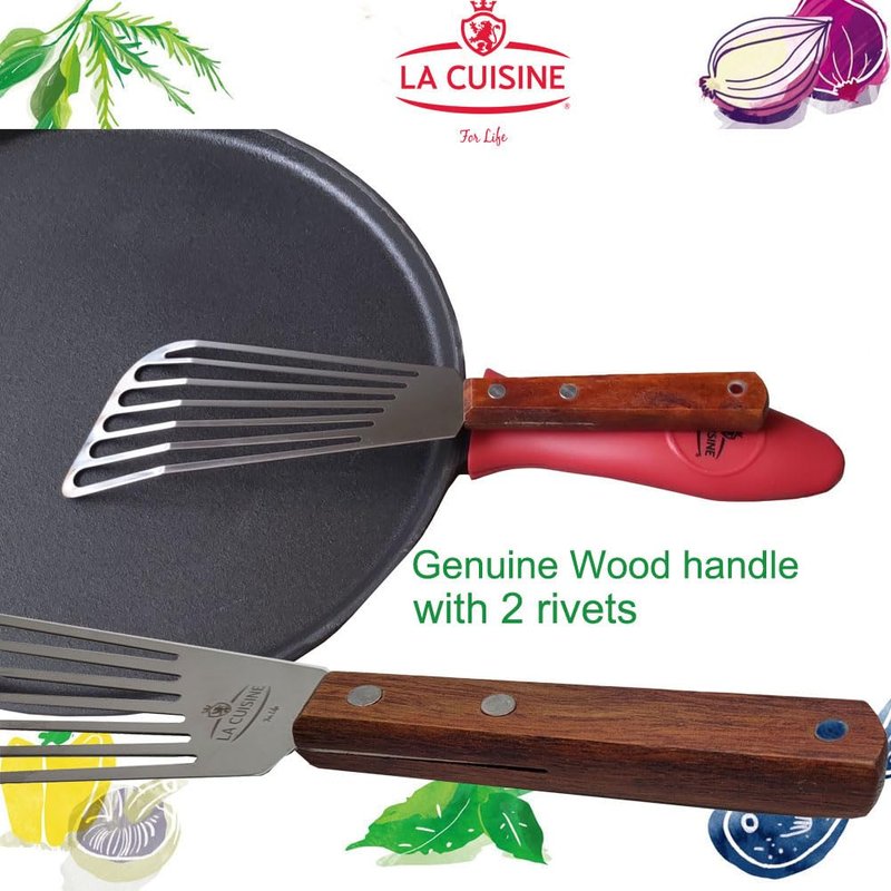 - The spatula is made of high-quality stainless steel with a riveted solid wood handle, which is durable, rust-resistant, and easy to clean.