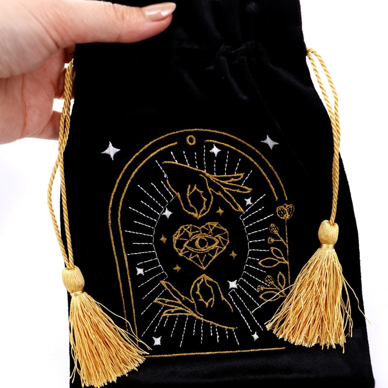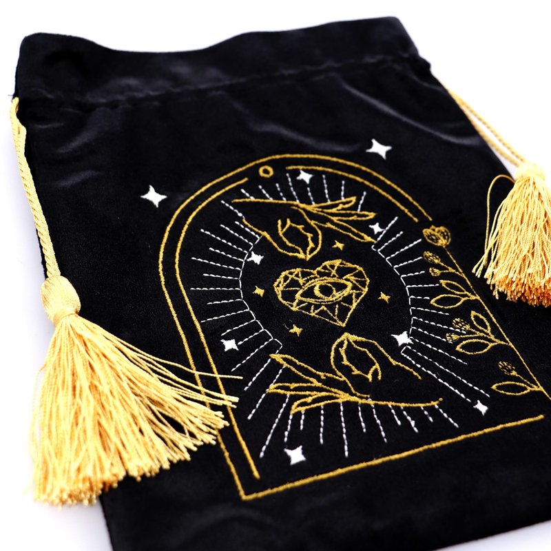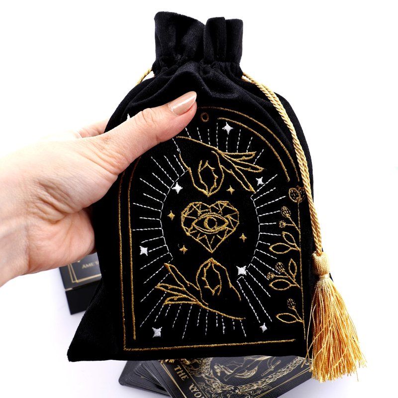 Crafted from plush purple velvet and adorned with enchanting black and gold embroidery, our tarot bags are designed to keep your precious decks protected in style. Finished with adorable gold tassels, these bags offer versatility beyond compare. Use them to safeguard your tarot cards or explore your creative whims. Additionally, these bags can be repurposed for storing jewelry, crystals, or other small treasures. Elevate your tarot experience with our exquisite tarot bags, perfect for multiple purposes.