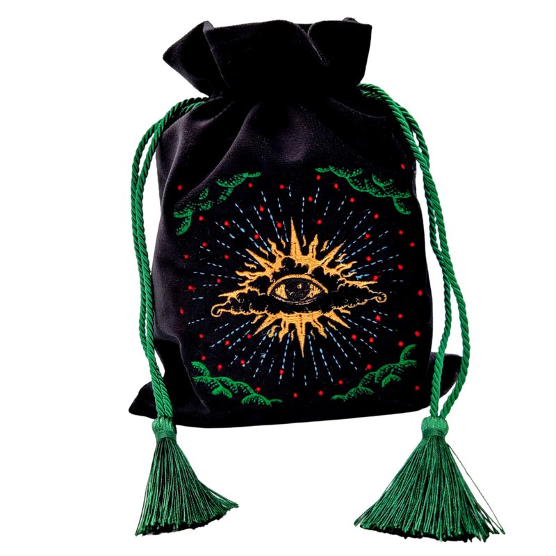 Crafted from plush purple velvet and adorned with enchanting black, gold, and green embroidery, our tarot bags are designed to keep your precious decks protected in style. Finished with adorable gold tassels, these bags offer versatility beyond compare. Use them to safeguard your tarot cards or explore your creative whims. Additionally, these bags can be repurposed for storing jewelry, crystals, or other small treasures. Elevate your tarot experience with our exquisite tarot bags, perfect for multiple purposes.