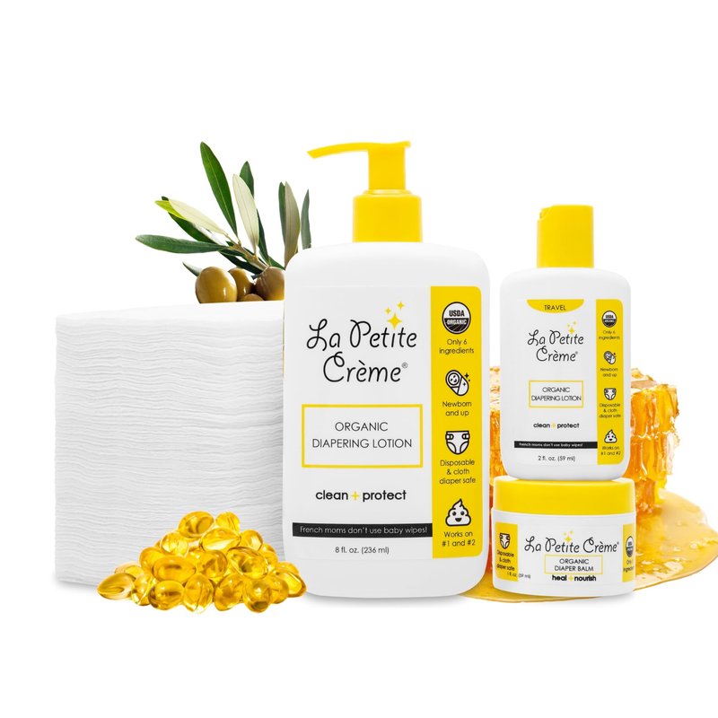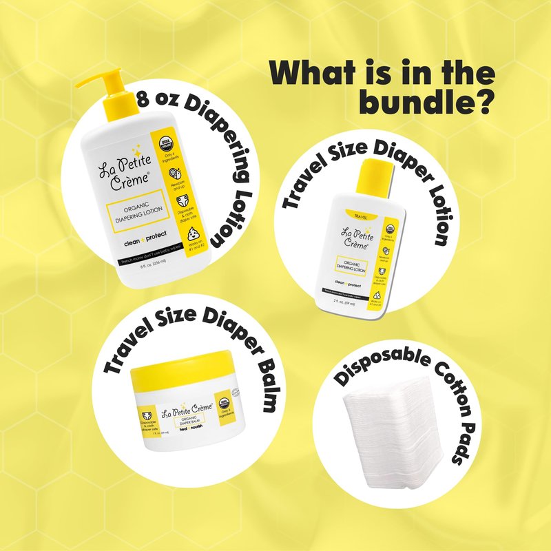 - Baby Care Kit Anytime and Anywhere: La Petite Creme introduces a comprehensive baby skin care solution, a must-have in your collection of newborn essentials. Ideal as a baby shower gift, the set includes our organic diapering lotion (8 oz), a travel-size lotion (2 oz), a travel-size diaper balm (1 oz), and 50 disposable cotton pads. Our value pack, featuring a larger diapering lotion (20 oz), balm (4 oz), and 100 pads, caters to all your baby care product needs.