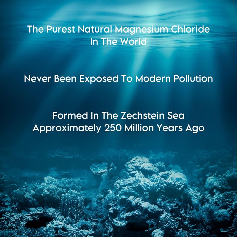 - ANCIENT DEEP SEA MINERALS: Formed 250 million years ago, and protected from modern day polution, our naturally-sourced, 100% pure magnesium chloride is only found 1500 meters underground in the ancient and pristine Zechstein Sea Bed.