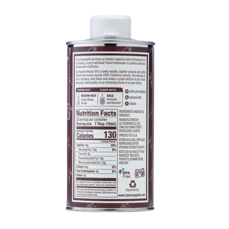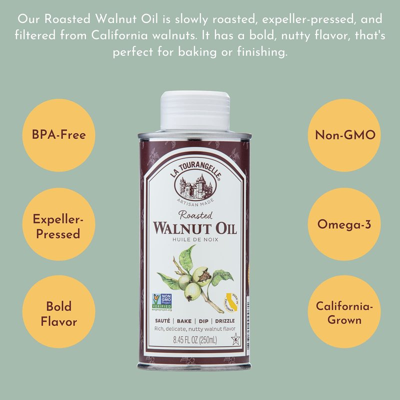 - Chef's Secret Ingredient: Delicate and pale in color, La Tourangelle Roasted Walnut Oil provides a rich yet elusively nutty taste; it has distinct notes of walnut nutmeats in every drop. Made from California walnuts selected for best flavor