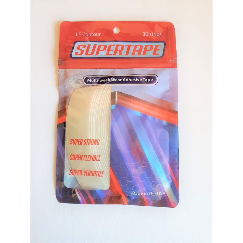Super tape is a brand new hairpiece tape that has recently become popular for extended wear bond. Lace front support tape is secure any lightweight attachment or appliance for an average 30-40 day continuous hold. excellent bond to and base material.It boasts an incredibly long-lasting hold time. However, many of our clients claim that it does not break down as much and is easier to clean after removal. *SuperTape Lace Front support 3" C Contour is safe for use of any base Material. *It will Not Leave any residue when removed. *Average Hold Time is More Than 4 Weeks.