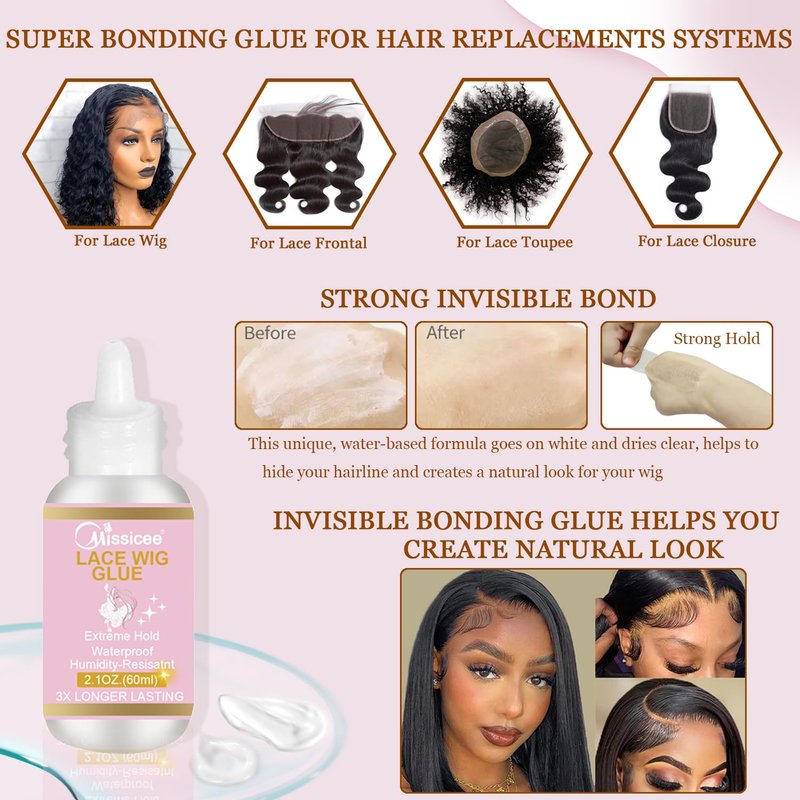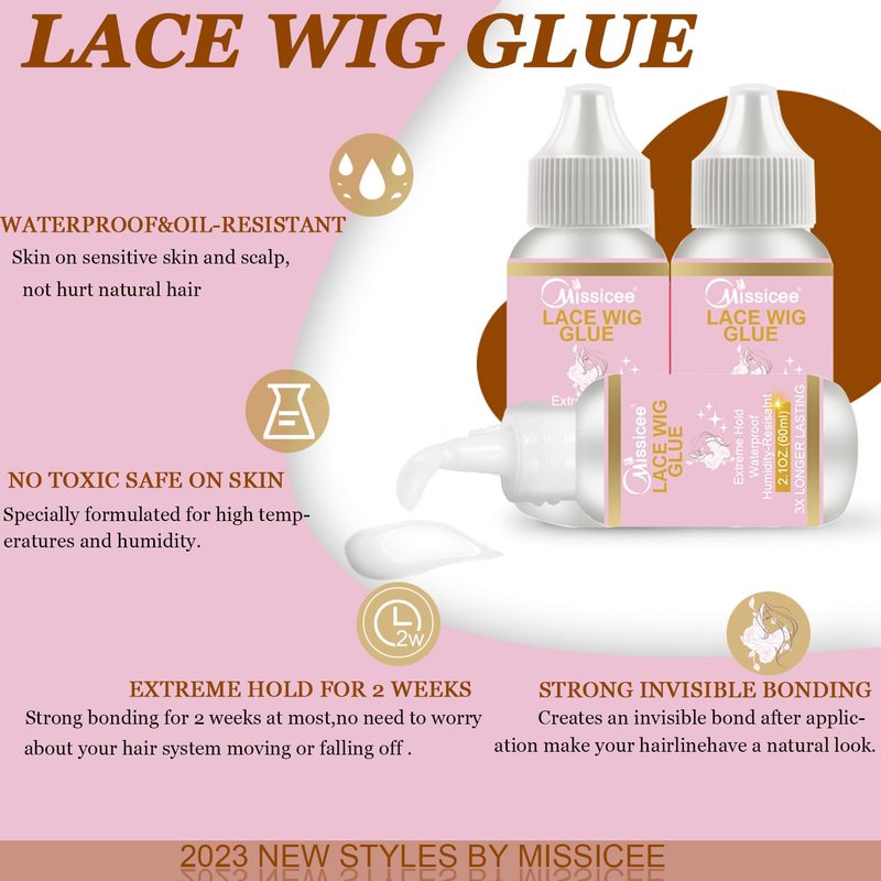 - Perfect Lace Wig Glue Set for Beginners: To make every girl find her own hairdressing and do more different hairstyles, show your beauty! Missicee full set meet your all needs for your style wigs, 60ml wig glue, 30ml wig glue remover, 75g hair wax stick, 130g edge control gel, 4x wig caps, 2x elastic bands, 1x rat tail comb and 1x edge brush, which are all tools that must be used when wearing a wig, saving you time and money. Let's bring the salon at home