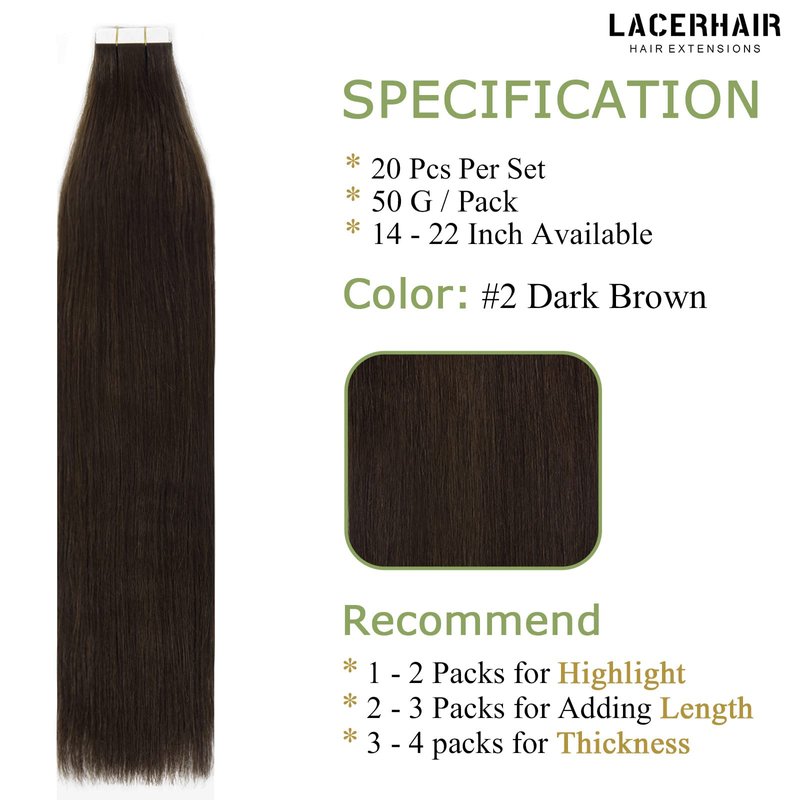 - 【Recommended Quantity】-- We Recommend 2-3 Packs for a Full Head Thin Hair, 3-5 Packs For Thicker Hair. Each Pack Of Lacerhair Tape in Human Hair Extensions is 50g, 20pcs, Light Weight.