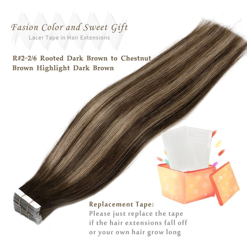 Lacer Tape Extensions Human Hair Rooted Dark Brown to Chestnut Brown Highlight Silky Straight Seamless Double Sided Tape in Extensions 18 Inch 50g 20pcs
