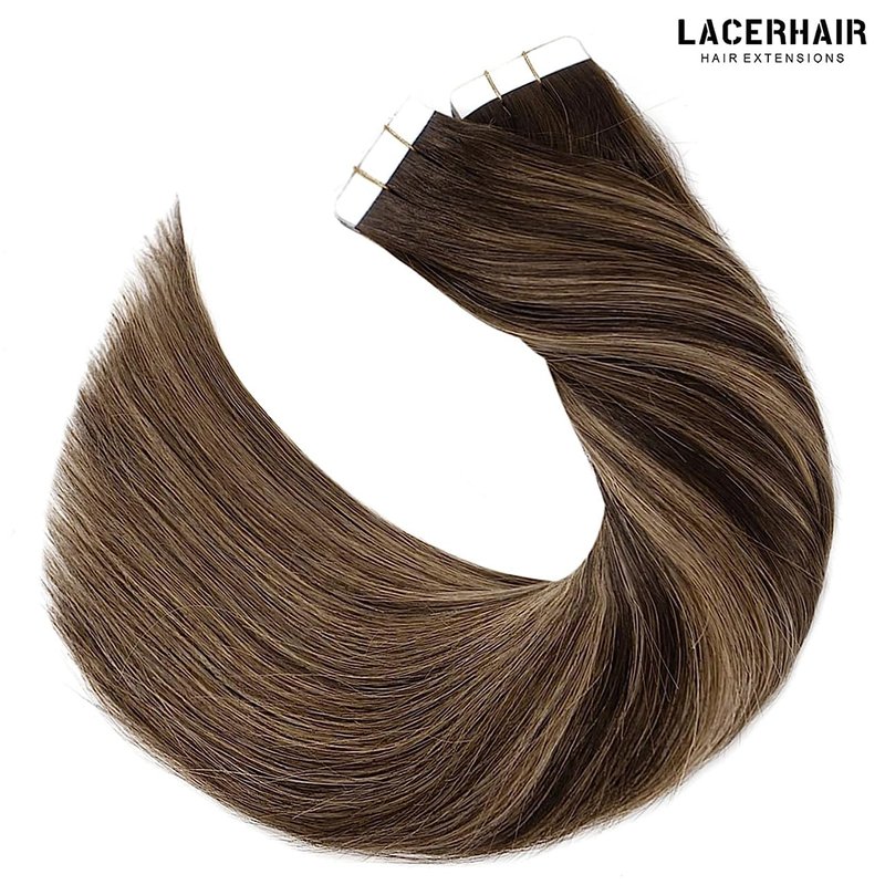 Lacer Tape in Hair Extensions Human Hair Chestnut Brown Mixed Dark Brown Hair with Dark Brown Roots Invisible Silky Straight Double Sided Tape in for Short Hair 50g 20pcs 16 Inch