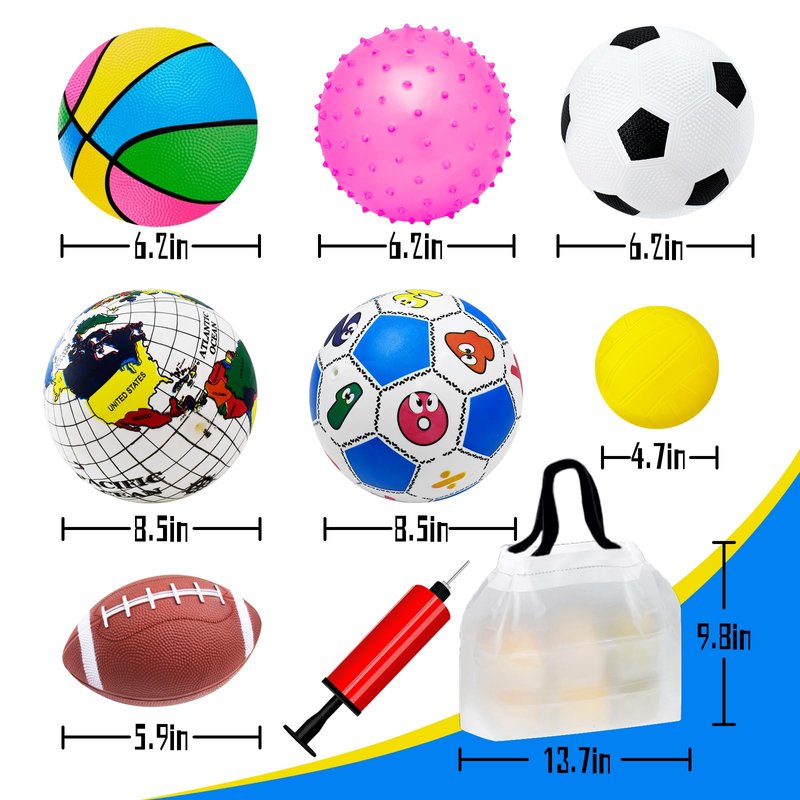- GREAT VALUE 7-PIECE SPORTS PUZZLE BALL SET! Comes with 1 pump(metal pin),Colorful Basketball (7in), Soccer Ball (6.2in), Football (5.9in), Thorn Ball (6in), Volleyball (4.7in), Earth Pattern Ball (8.5in), Number Soccer Ball (8.5in). Carefully put together set, the perfect for little hands to grip and play with for outdoor activities and the kids can enjoy a variety of games.