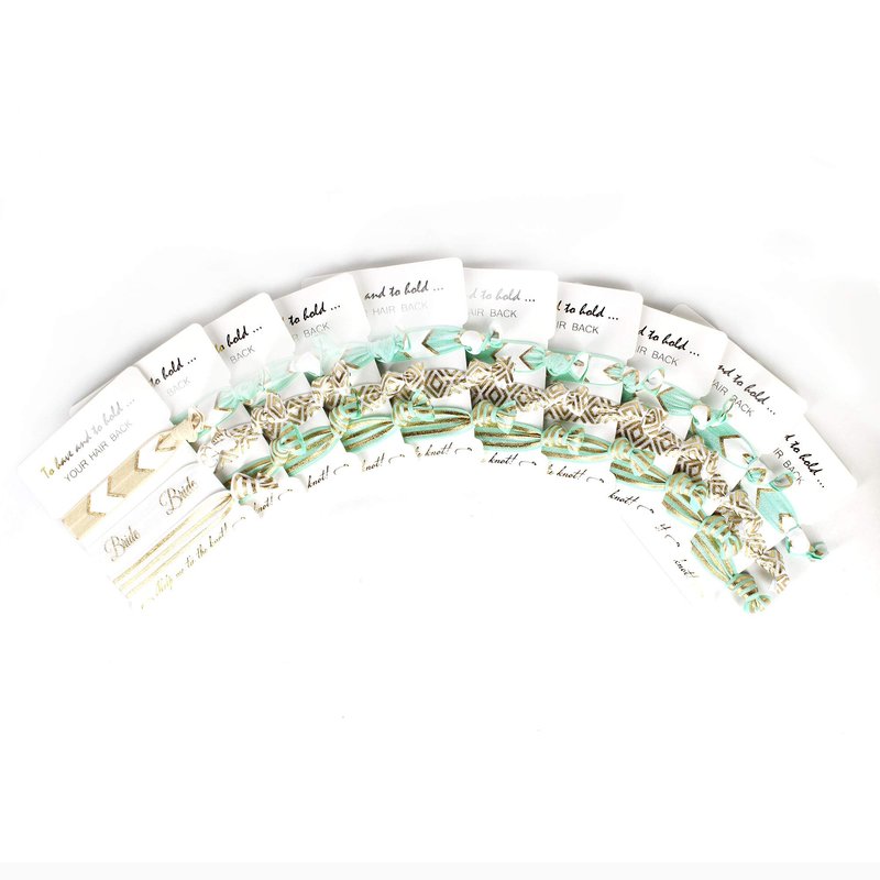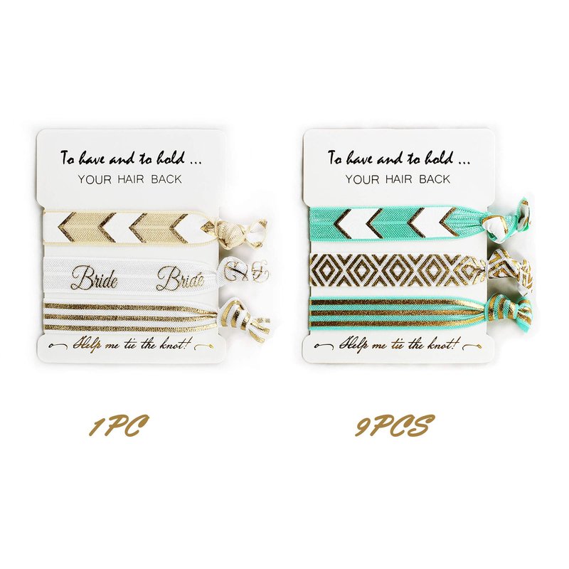 - BRIDE TRIBE GIFTS -Total 10 packs hair ties, 1 white pack for bride, 9 pink pack for bride tribe. There are 3 different hair ties for each pack.