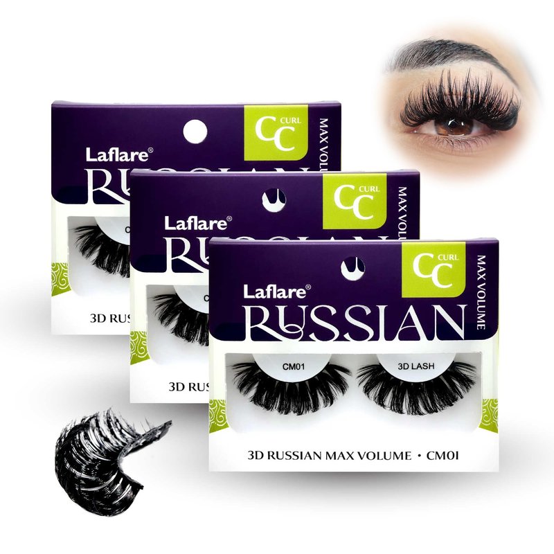 Laflare 3D False Eyelashes Russian Max Volume Strip Lashes | Fluffy, Wispy, Lightweight | Faux Mink Eyelashes Extension C Curl Wispy Handmade Soft Reusable 3 Packs Value Combo. (FCM01X3C)