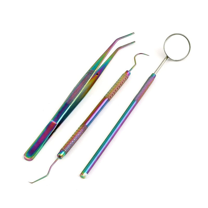 LAJA IMPORTS Dental Hygiene Set - 3pcs Basic Dental Instruments Stainless Steel Dental Tooth Pick, Mouth Mirror ,Cotton Plier - Dentists Tools Set Is Ideal For Personal Use & Pet Friendly Rainbow Tita