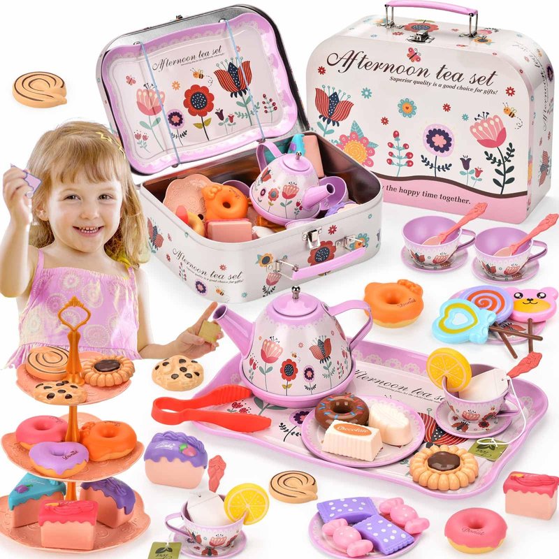 Lajeje 52-Piece Tea Party Set for Little Girls, Pretend Kitchen Toy for Kids 3 4 5 6 Year Old, Girls Toys with Tin Tea Set, Desserts & Metal Carrying Case, Birthday,Stocking Stuffers for Kids