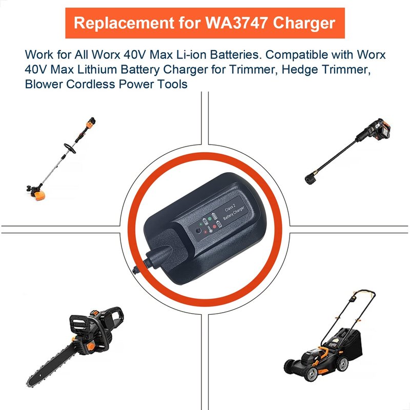 The LALAFO WA3747 replacement for Worx 40V lithium-ion battery charger, Compatible with Worx WA3580 battery and charges 40-volt batteries in about 8 hours. Perfect suit for 40V Max li-ion batteries of Worx 40V cordless tools: WG180 WG280 WG380 WG580 WG776.
