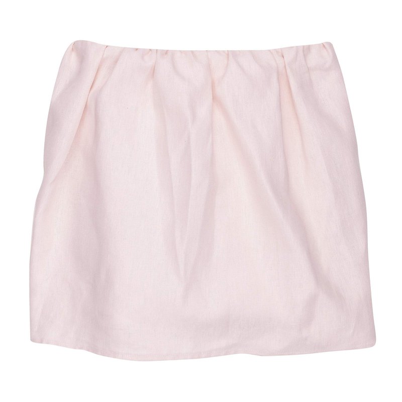 This pretty pale pink linen/rayon blend crib skirt (dust ruffle) is shirred all around and has a 14 ½” drop. It has split corners for easy placement around the posts of the crib. It adds a designer finishing touch to your baby’s crib.