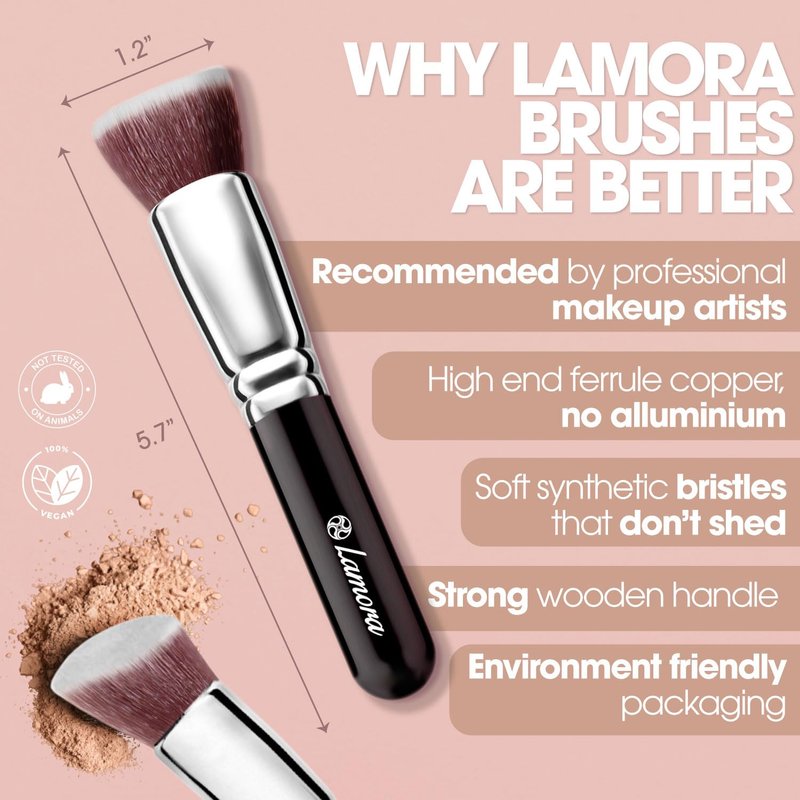 LAMORA Foundation Brush for Liquid Makeup - Kabuki Face Brush for Cream, Powder, Blush, and Concealer - Flat Top Blending, Buffing, Stippling Brush
