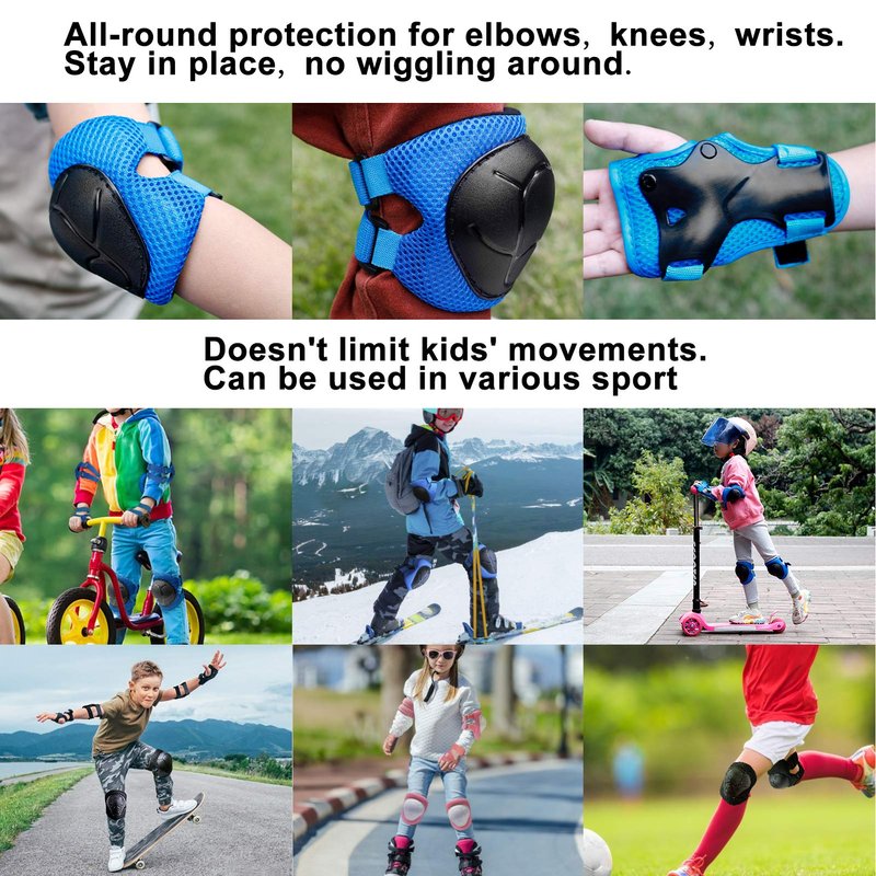 - [SECURE FIT, ALL-ROUND PROTECTION] The knee pads for kids will not hinder kid's movement, no strain. Due to double elastic straps on kneepads and elbow pads and thumb hole on wrist guards, the kids protective gear set stay in place without wiggling around. 2 x elbow pads, 2 x knee pads, 2 x wrist pads, 6pcs of protector set brings all-round protection in various sports such as roller skating, skateboarding, rollerblading, riding scooter, biking, cycling, or playing basketball, football.
