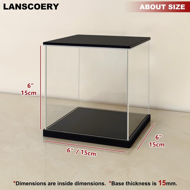 LANSCOERY Clear Acrylic Display Case with Light, Assemble Cube Display Box Stand with Black Base, Dustproof Protection Showcase for Collectibles Memorabilia Figurines (6x6x6inch;15x15x15cm)