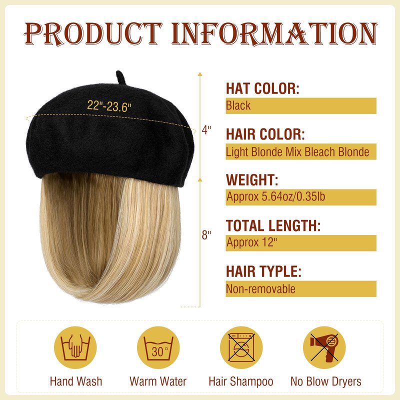 - 【Warm Tips 】The French beret hat wig can be hand washed when needed.Just using a little mild shampoo in cold or warm water,finally allow it to air dry.Smooth the hat before air dry to reduce the washing crease.COLORS may vary slightly depending on your personal computer or cellphone monitor settings.
